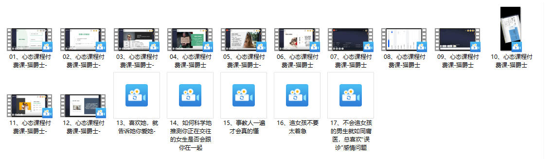 内容包括多段实战视频(如01-心态课程付费课-猫爵士-.mp4),详细讲解如何构建能量吸引、增强自信心以及应对分手危机的心理调适方法。此外,课程还融合了情商提升、社交技巧等模块,旨在帮助学员从内在建设出发,改变消极心态,灵活运用到实际交往中。