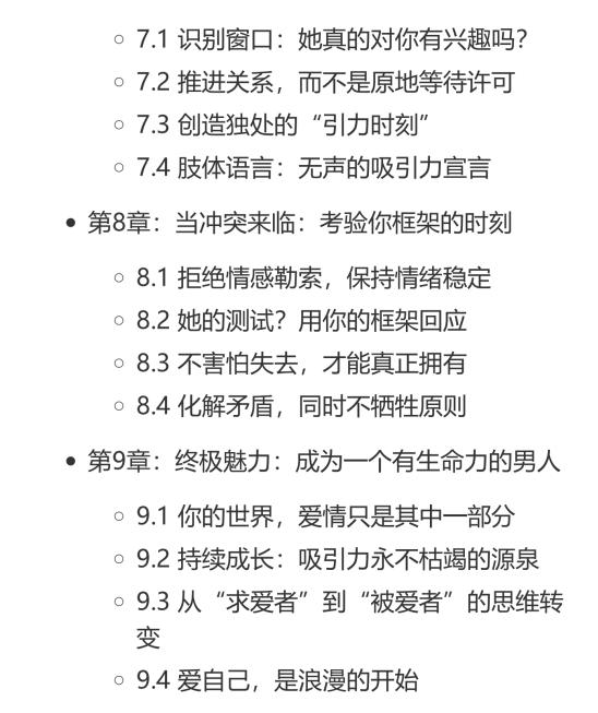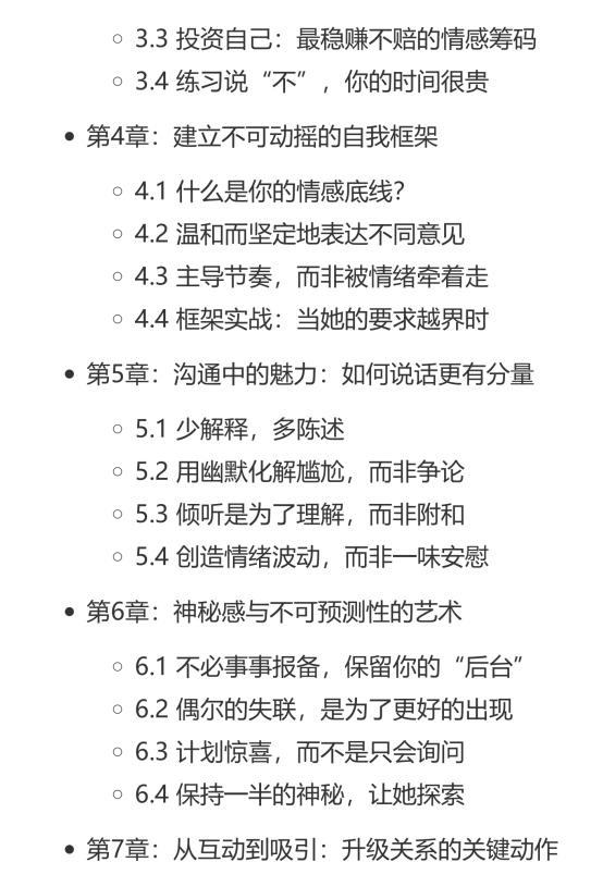 你是否发现是小心翼翼、百依百顺,她反而越疏远?问题不在于你不够好,而在于你太好了,好到失去了那份令人心动的张力。这本书将为你揭示,所谓“坏”并非品行不端,而是一种内在的自信、框架与不可预测性的魅力组合。你习惯性付出,却沦为情感中的“背景板”,根源在于过度寻求认可,丧失了自我价值感。真正的吸引力源于你自身的生命力和原则。一个生动的心理学实验表明,人们更珍视那些需要付出努力才能获得的关系,无条件的好反而会稀释情感价值。改变从建立自我框架开始。停止随叫随到,将精力投入能提升自身价值的事物上;学会温和而坚定地表达不同意见;创造偶尔的不可预测性,为相处增添新鲜感。记住,魅力在于你是一个有自己世界和节奏的男人。”当你开始爱自己,全世界才会来爱你;当你不再乞求爱,爱反而会不请自来。”行动的第一步,不是去表白,而是从今天起,把讨好她的时间,用来投资自己。